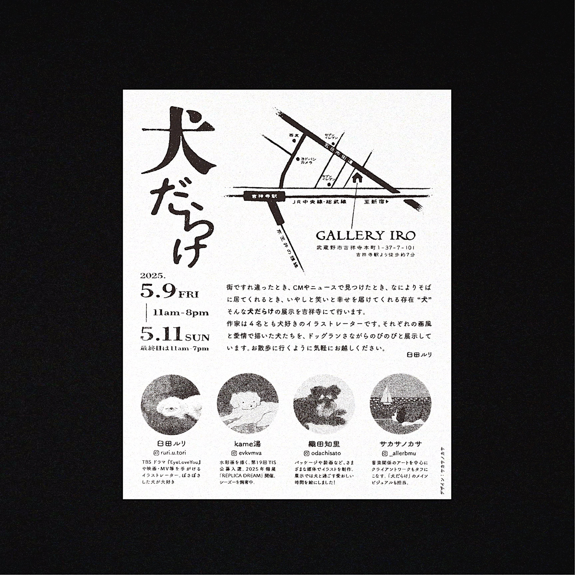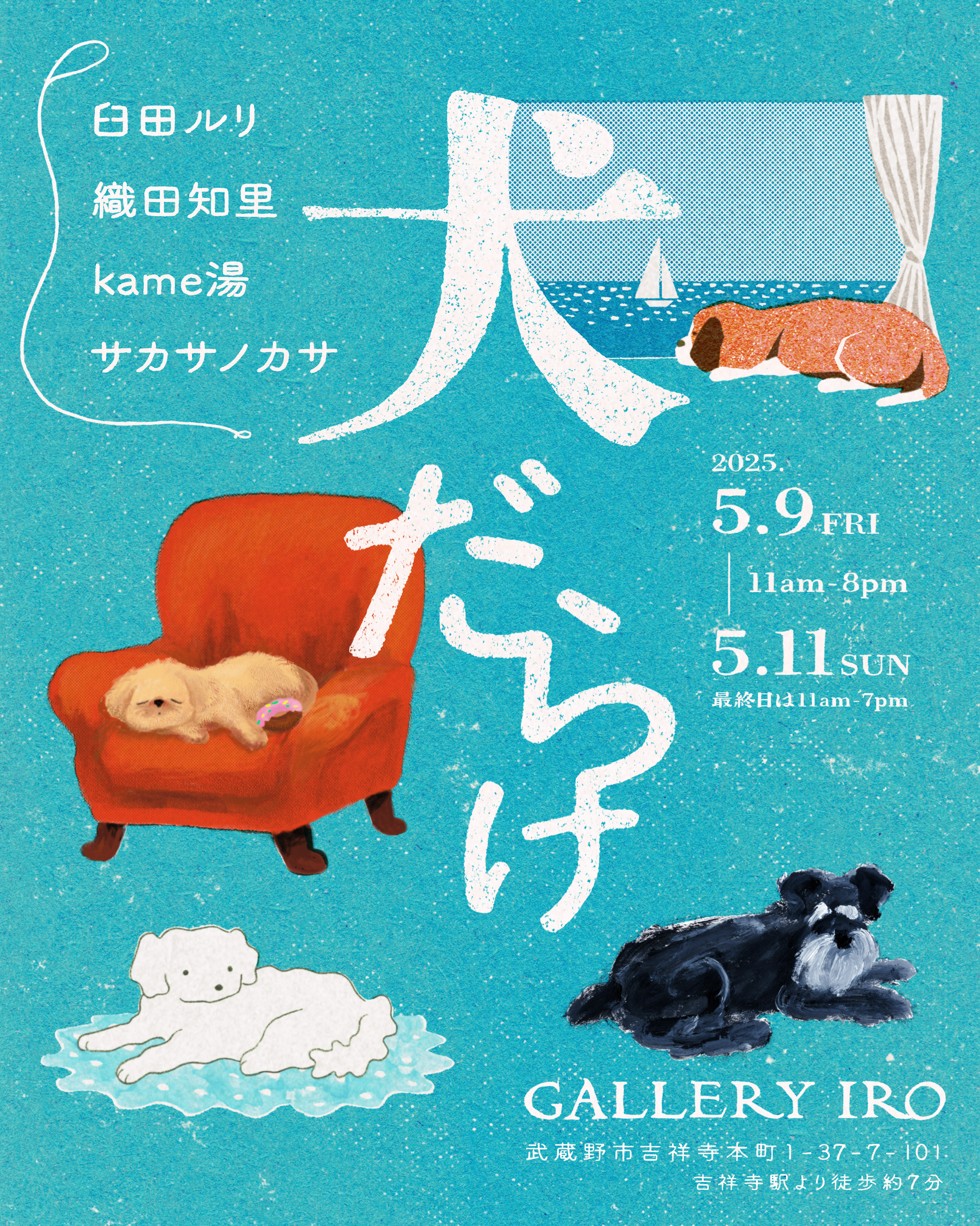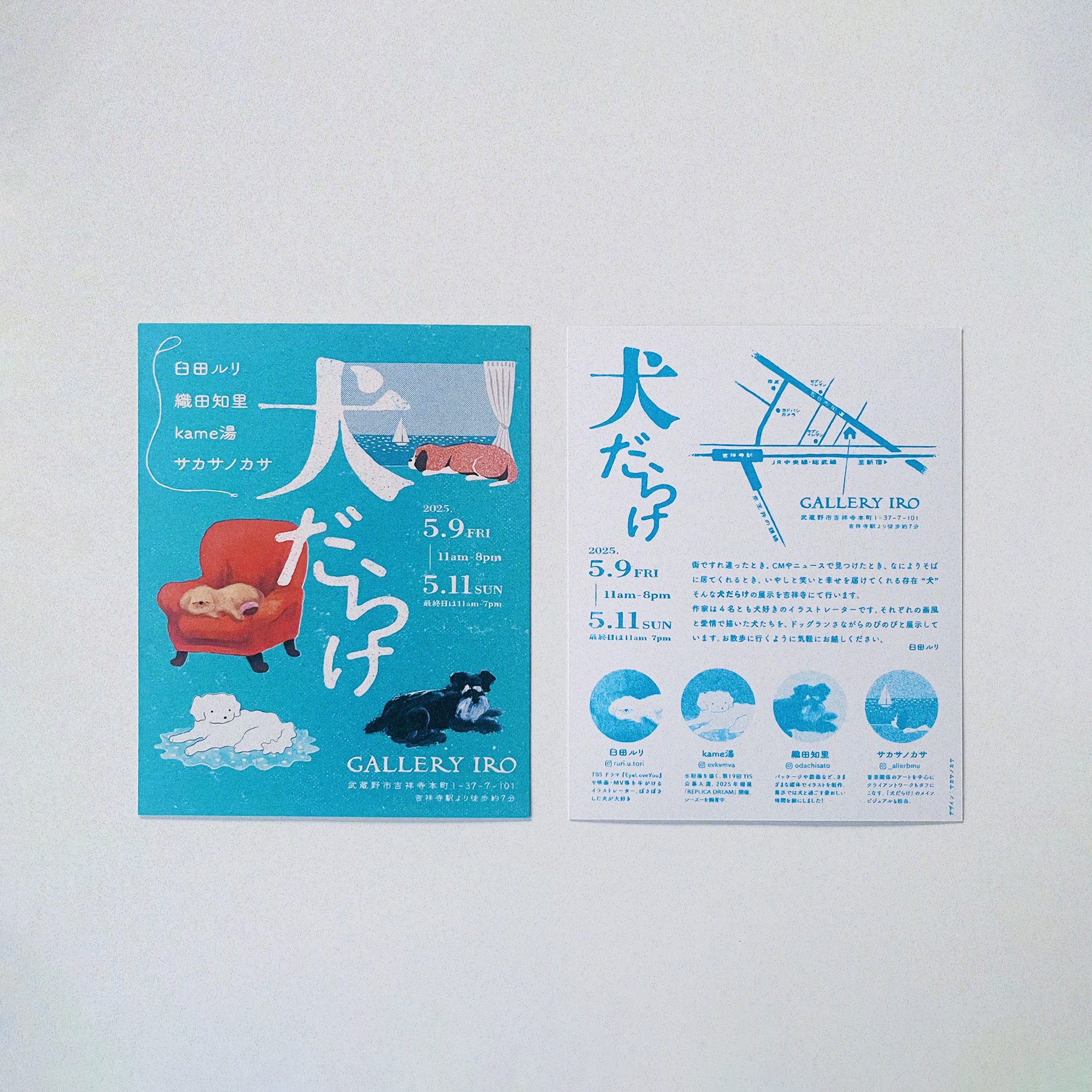 臼田ルリ、織田知里、kame湯と共同開催のグループ展「犬だらけ」のメインビジュアル・DMのデザインを担当しました。